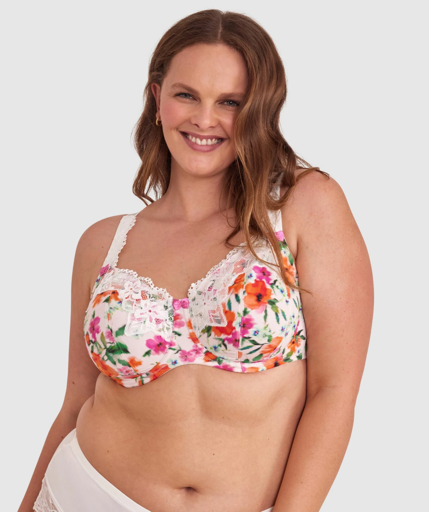 Make a statement with our Sapphire Full Coverage Underwire because every curve deserves to be celebrated in style! Adorned with vibrant florals, it adds a pop of colour to your closet. Delicate lace graces your cleavage, adding a touch of allure. Features: – Bright floral print on microfibre fabrication – Contrast ivory lace trim on top cup edge – Matching ivory satin bow at centre front – Wide adjustable shoulder straps – Hook & eye closure at back – Model 1 is wearing a 16DD/XL top and 16/XL bottom, with bust 97cm/38in, waist 82cm/32in, and hip 111cm/44in. She stands at 173cm/5’8in. Style # 00015749